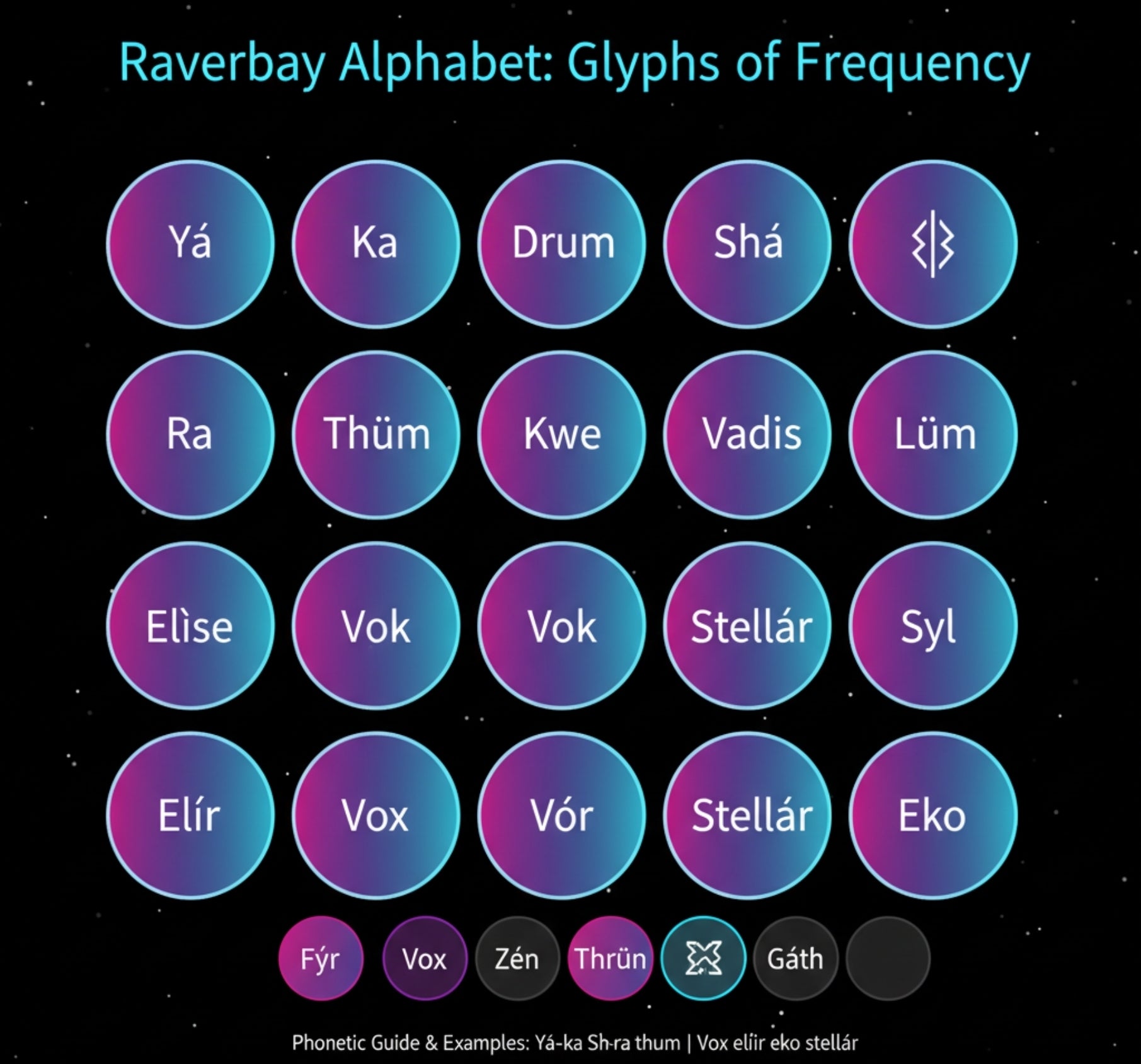 This guide introduces the **Raver Bay Universal Language**, *Rav’ka Thûm*, designed to embody the vibrational power of ancient shamanic tradition fused with modern ritual techno frequency. Explore each symbolic glyph, its phonetic sound, and archetypal meaning — forming a living spiritual code.